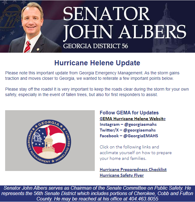 Sen. John Albers serves as Chairman of the Senate Committee on Public Safety. He represents the 56th Senate District which includes portions of Cherokee, Cobb and North Fulton counties. He may be reached at his office at 404.463.8055 or by email at [email protected]. For all media inquiries, please reach out to [email protected].